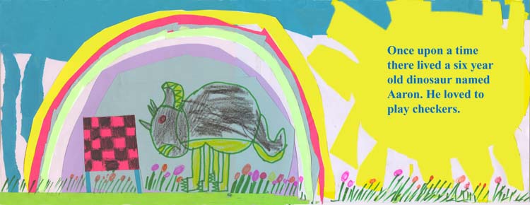 The story is about a six-year-old dinosaur Aaron who likes to play checkers. One day his parents are too busy to play.